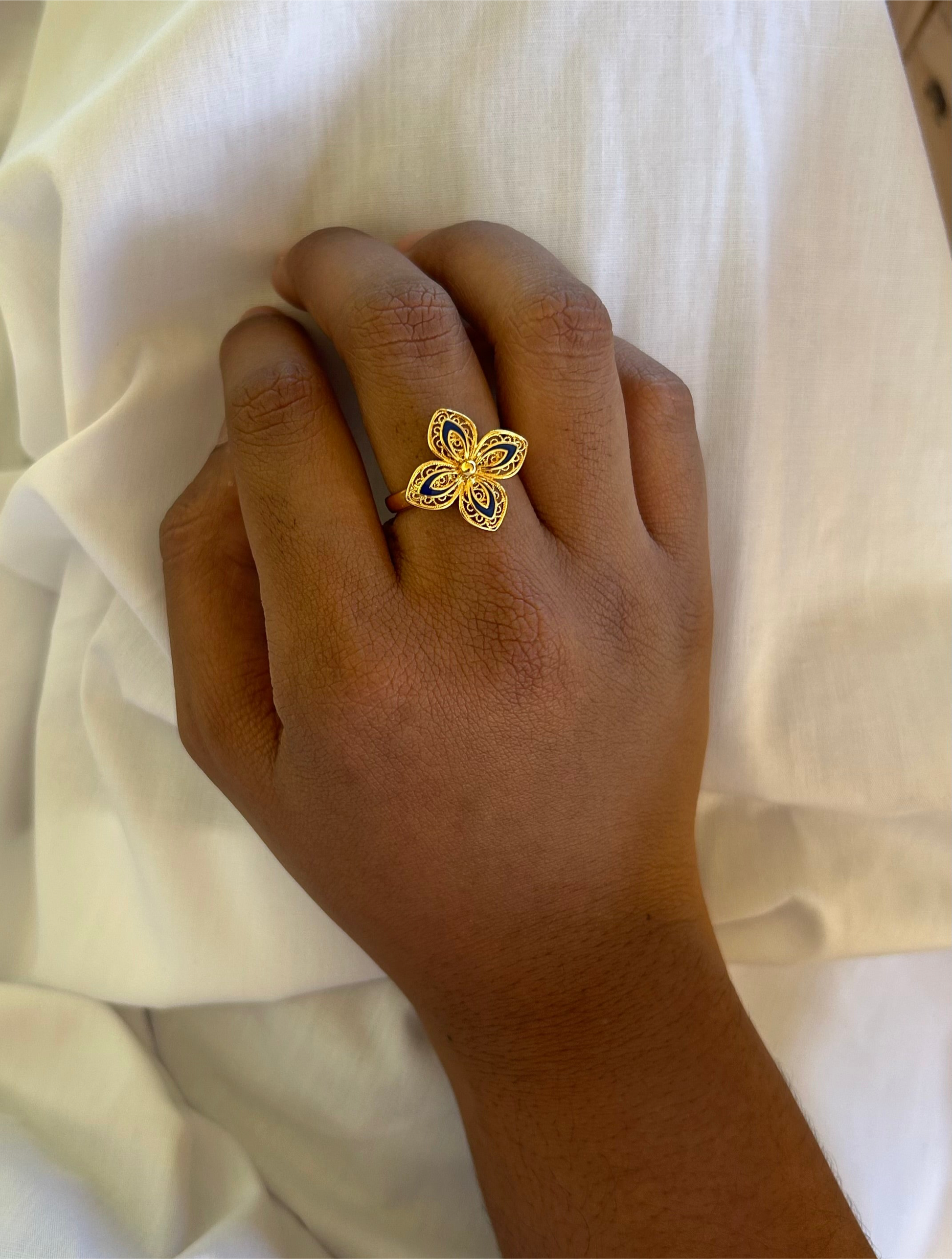 Adorn your hands with this finely crafted, flower-shaped gold ring adorned with deep blue enamel details. Its delicate and refined design evokes timeless elegance, perfect for adding a touch of character to your outfits, whether everyday or more formal.