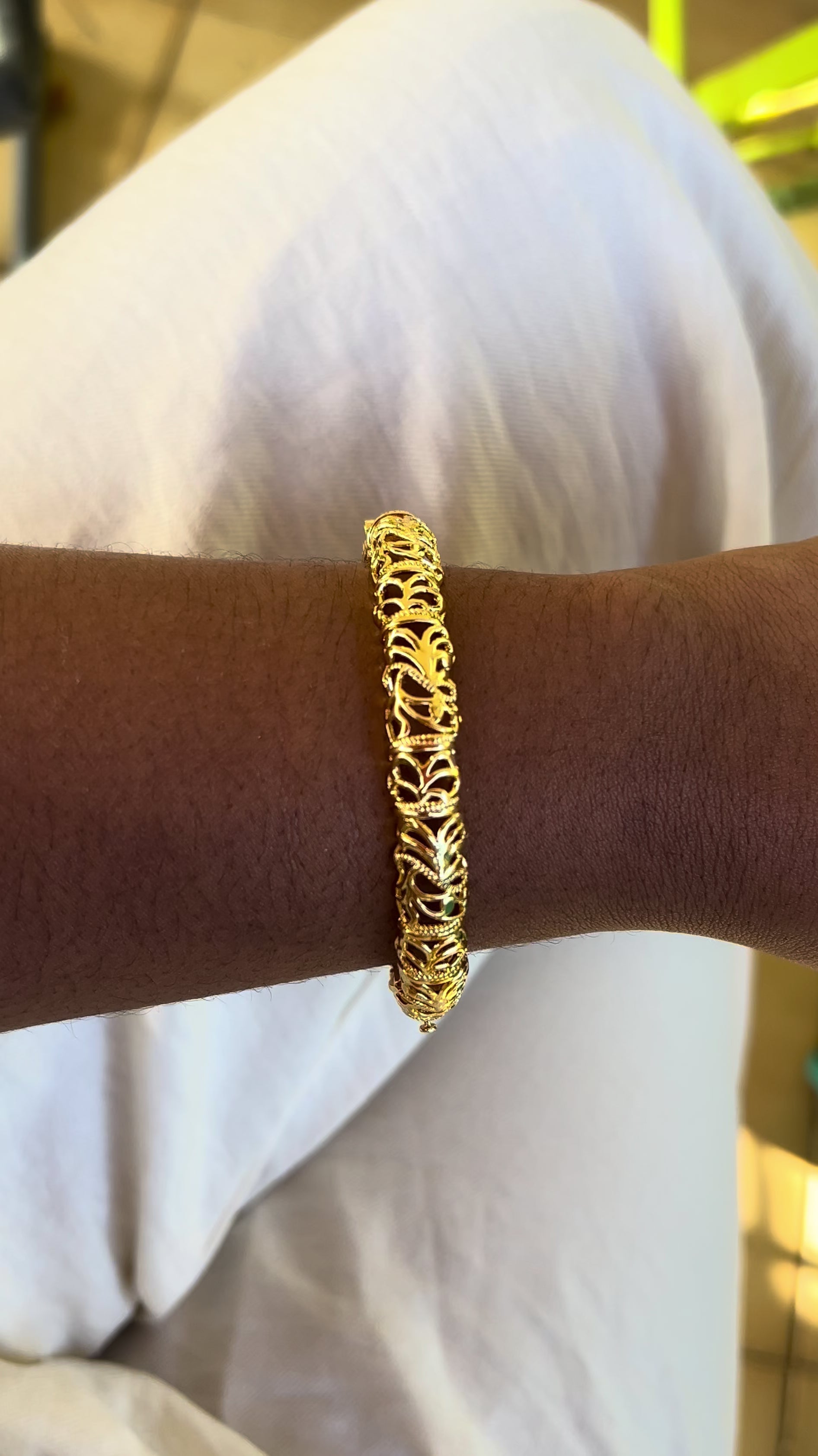 Majestueux et infiniment raffiné, ce jonc incarne l’essence même du luxe. Son délicat travail de filigrane révèle une dentelle d’or massif sculptée avec une précision remarquable, où chaque courbe capte la lumière et la sublime en un éclat précieux.
