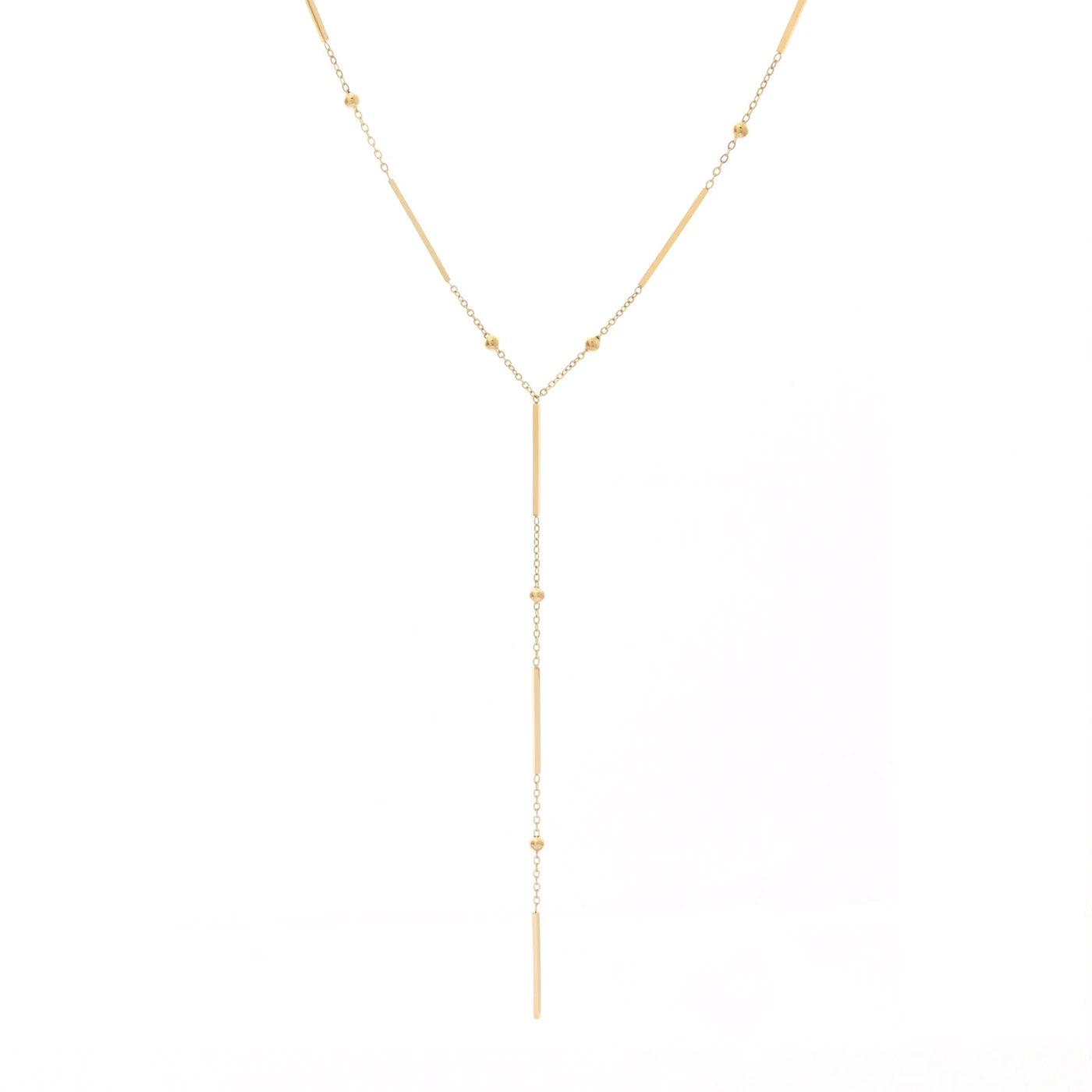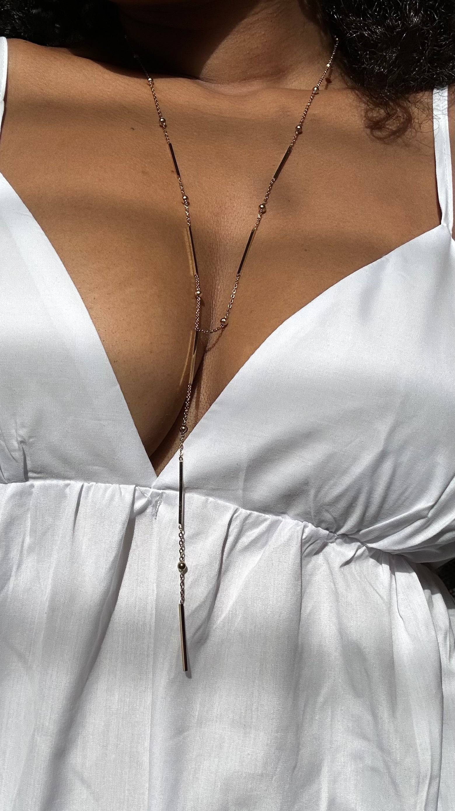 Le collier Épure séduit par son élégance minimaliste et sa silhouette en Y qui allonge gracieusement le cou. Fait de maillons fins ponctués de petites perles dorées et de tiges allongées, il incarne la féminité discrète et la modernité raffinée.🌸