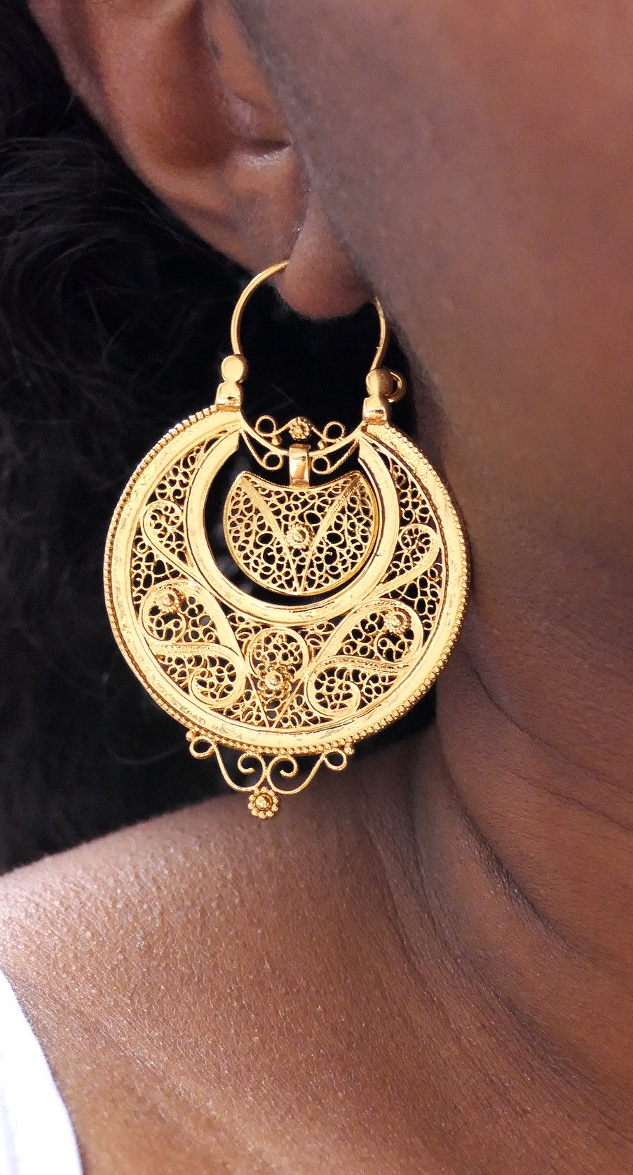 Prestige se distingue par un travail minutieux de dentelle dorée, offrant une profondeur visuelle qui attire le regard à chaque mouvement. Son design circulaire, orné de volutes et d’un croissant stylisé, incarne l’élégance et la richesse culturelle d’un bijou pensé pour les femmes inspirées.