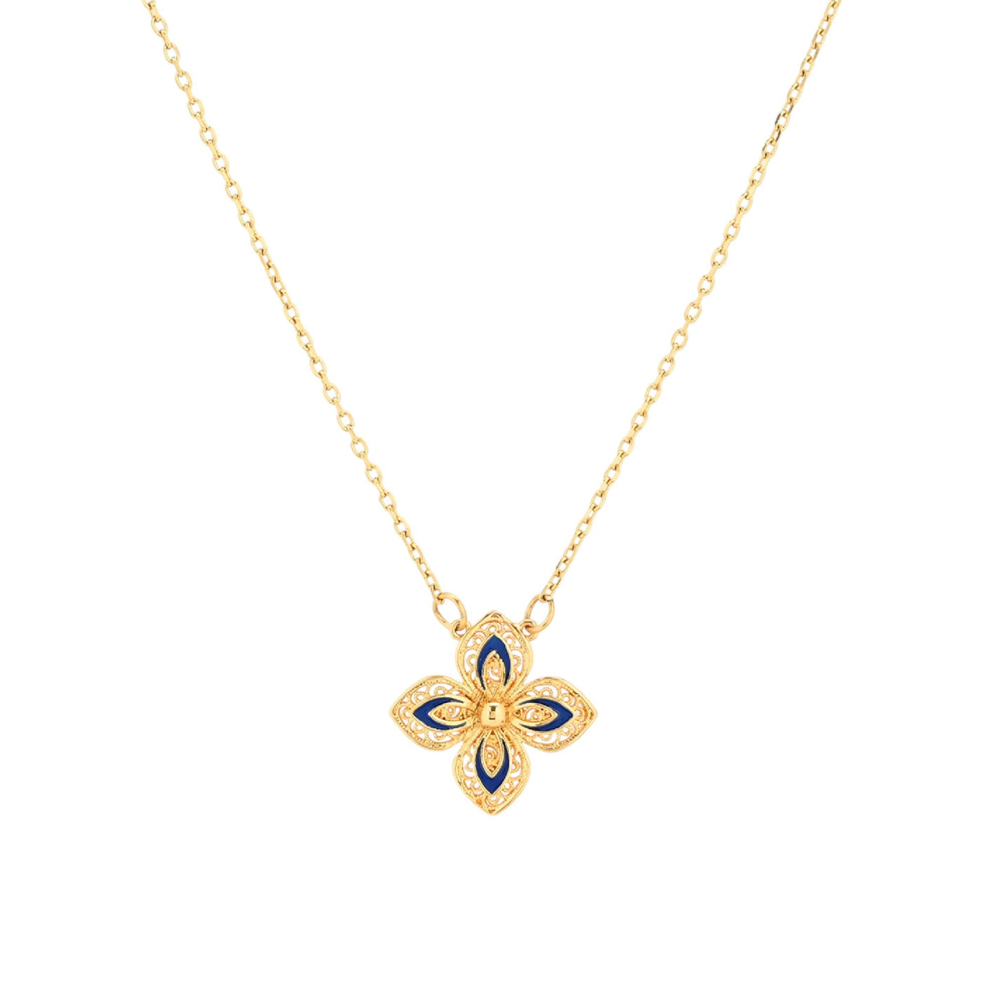Sublimez votre look avec notre Collier Fleur Bleue, une pièce raffinée qui allie délicatesse florale et éclat doré. Ce collier est orné d’un pendentif en forme de fleur à quatre pétales, finement travaillé avec des touches d’émail bleu profond et des détails dorés gravés avec soin. Chaque pétale évoque la finesse artisanale et apporte une note de couleur élégante à votre tenue.